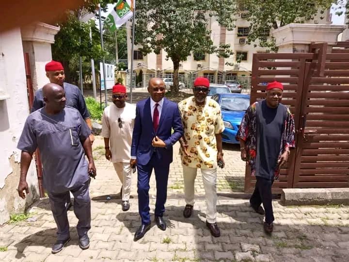 The Governorship Candidate of Africa Democratic Congress (ADC), Mr. John Chuma Nwosu and running mate, Chief Dr. Sir. Ndubisi Nwobu arrives party headquarters at Abuja.