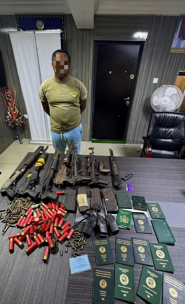 The operatives of the Command raided his house in Mushin, and recovered cache of weapons and incriminating items he freely admitted he was using for his killing operations with his gang. The firearms recovered include: Two (2) AK-47 rifles, One (1) K2 Assault rifle, One (1) Red Ryder rifle , Three (3) pump action rifles , Two (2) locally made single-barrel pistols, Five (5) magazines, Fifty-seven (57) live cartridges, Seventy (70) 5.56 live ammunition, Twenty-seven (27) 9mm ammunition, One (1) expended 5.56 ammunition, One (1) dagger, Three (3) walkie-talkies and Nine (9) international passports belonging to different individuals.”