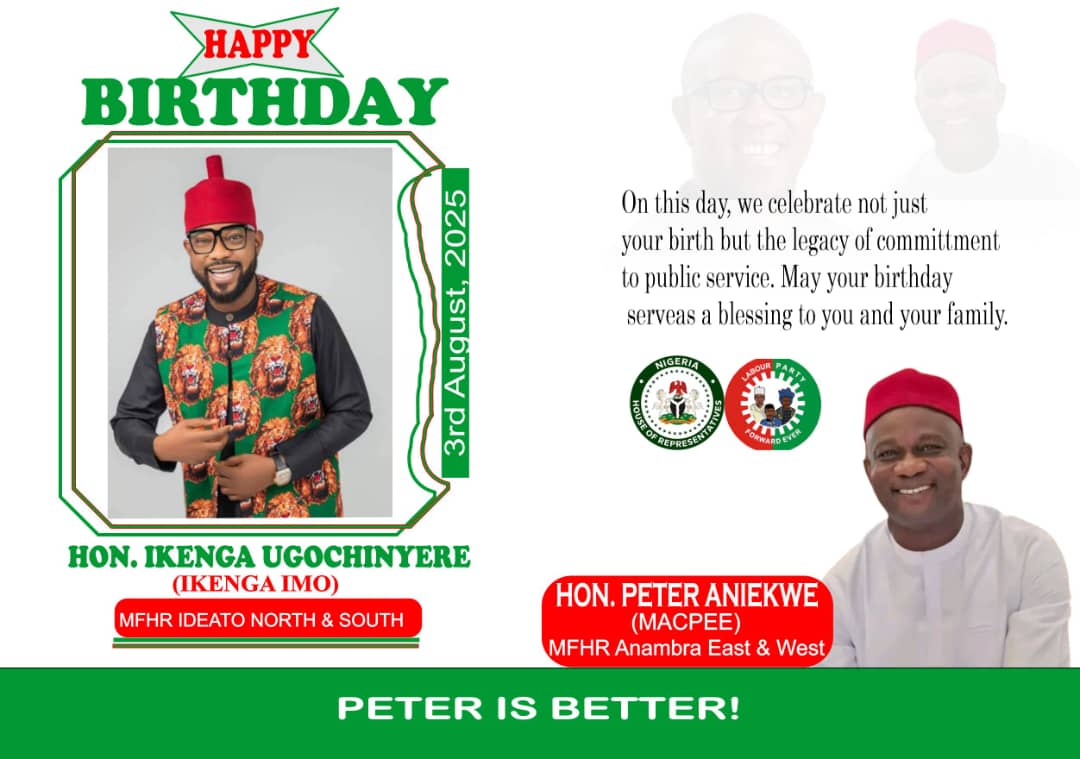 Hon. Peter Aniekwe, member representing Anambra East and West Federal Constituency, extends birthday felicitations to Hon. Ugochinyere Ikenga, the esteemed member representing Ideato Federal Constituency. On behalf of the entire Anambra East and West Federal Constituency, Hon. Aniekwe congratulates Hon. Ikenga on his birthday and lauds his commitment to progress.