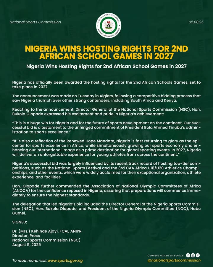 Nigeria has been officially awarded the hosting rights for the 2nd African School Games, a major sporting event set to take place in 2027. The announcement was made on Tuesday in Algiers following a competitive bidding process that saw Nigeria triumph over other strong contenders, including South Africa and Kenya.