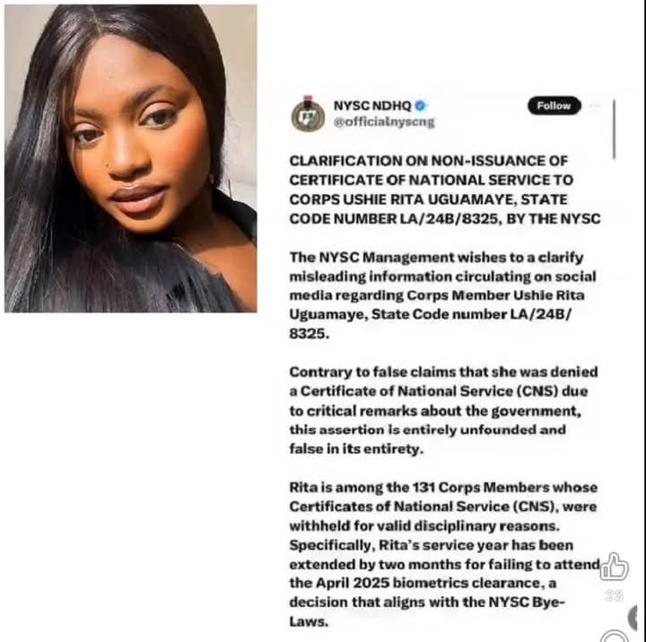 In a statement released on Sunday, the NYSC described the allegation as false and baseless, insisting that the delay in issuing her certificate is purely procedural.