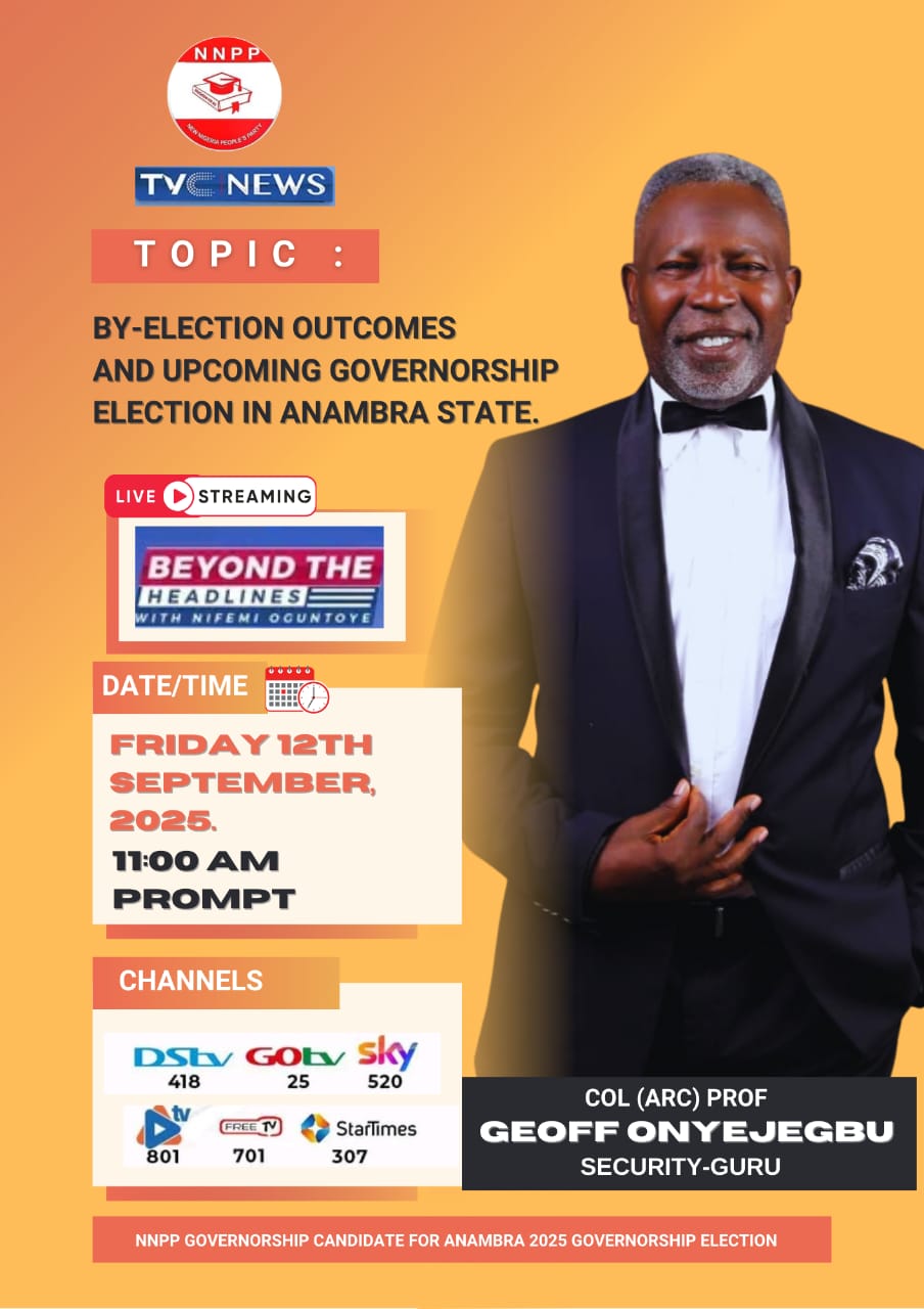 The New Nigeria People’s Party (NNPP) governorship candidate, Col. Prof. Geoff Onyejegbu, is scheduled to appear live on TVC News at 11:00 AM today.