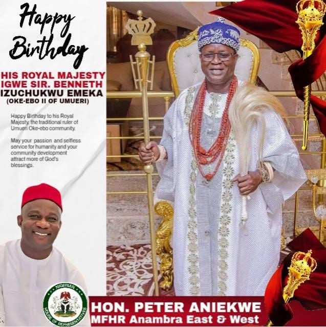Hon. Peter Aniekwe, representing Anambra East and West Federal Constituency, has extended birthday greetings to HRM Igwe Dr. Sir Ben I. Emeka (Okebo II), praising his unwavering commitment to the peace and progress of the Umueri people.
