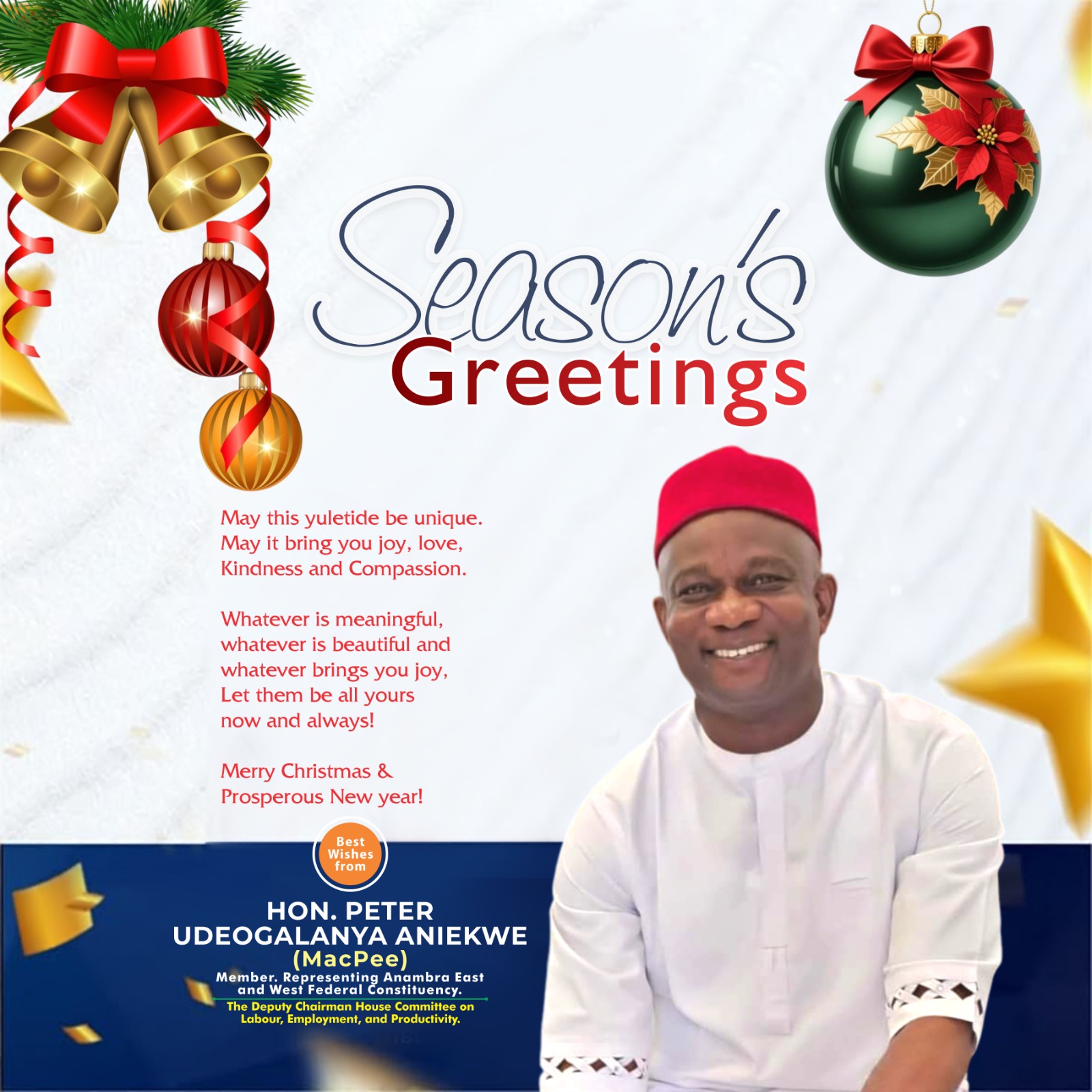 Hon. Peter Aniekwe (Macpee), Member representing Anambra East and West Federal Constituency, has extended warm Merry Christmas greetings to the people of Anambra East and West Federal Constituency, describing the season as one that embodies love, peace, and hope with the celebration of the birth of Jesus Christ.