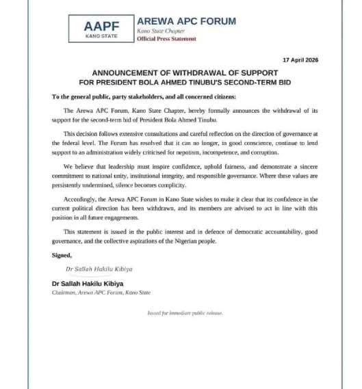 The Arewa APC Forum, Kano State chapter, has announced the withdrawal of its support for the second-term bid of President Bola Ahmed Tinubu, citing concerns over governance and leadership direction.